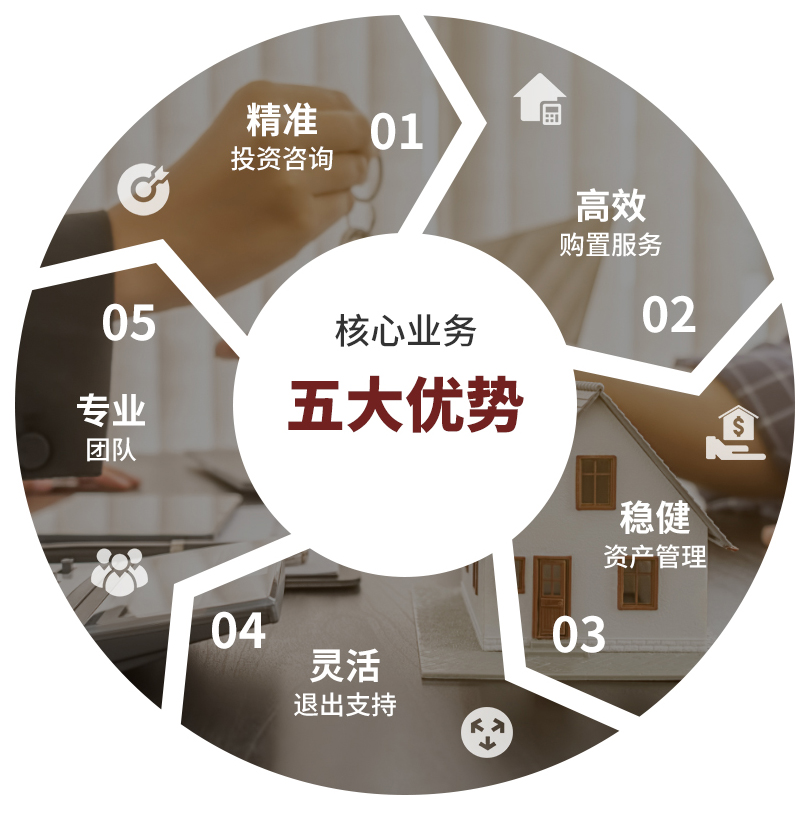 核心优势:精准投资咨询、高效购置服务、稳健资产管理、灵活退出支持、专业团队。